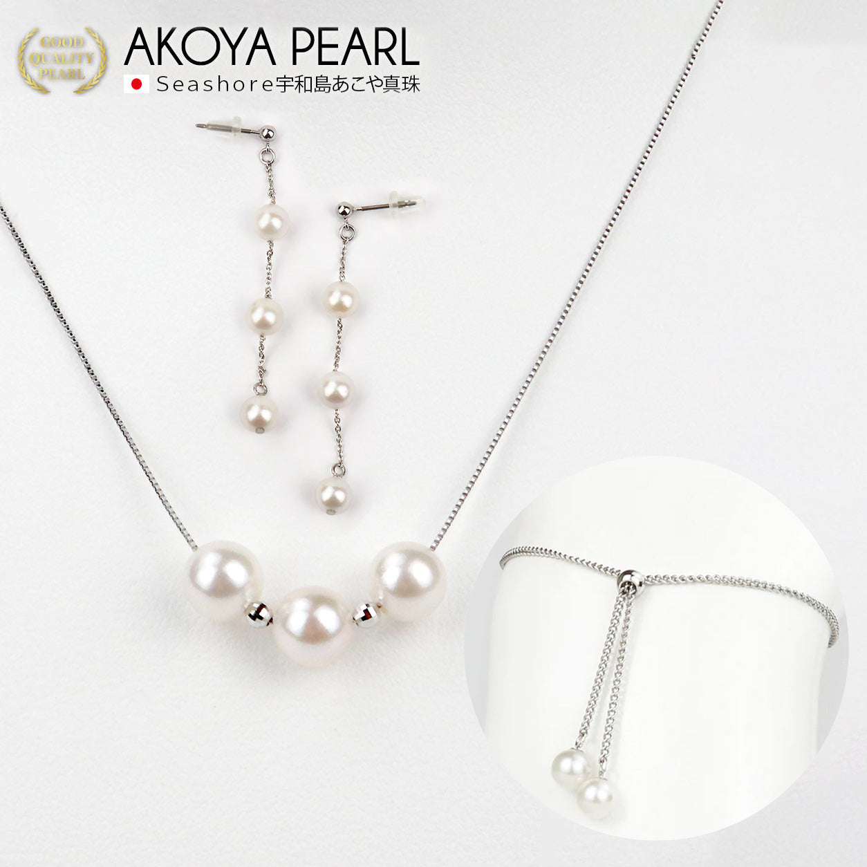 【3泊4日レンタル】あこや真珠3点セット|3粒スルー ネックレス ベビーパール ステーションピアス 2WAYパールブレスレット